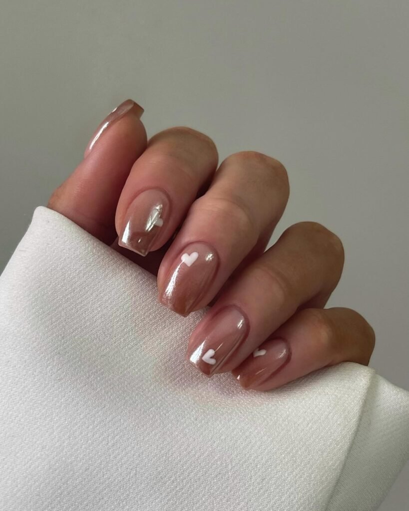 This sweet and minimal nail design is perfect for Pinterest lovers who adore soft, romantic details. The sheer nude base gives the nails a natural, clean appearance, while the tiny white hearts add a playful touch. The short, softly shaped nails make this look wearable and elegant. It’s a beautiful choice for a subtle manicure that still feels charming, modern, and save-worthy.