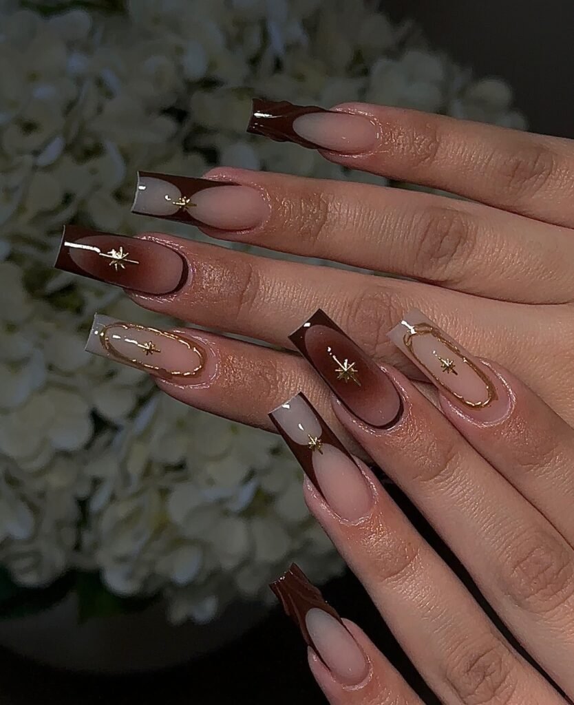 This manicure is a dreamy take on brown French tips, featuring soft nude bases, rich brown edges, and delicate gold star accents. The design feels elegant, slightly celestial, and very Pinterest-worthy. The square shape keeps it structured, while the metallic details add a luxurious finish. It’s perfect for anyone who wants a classy manicure with a magical, detailed, and fashion-forward look.