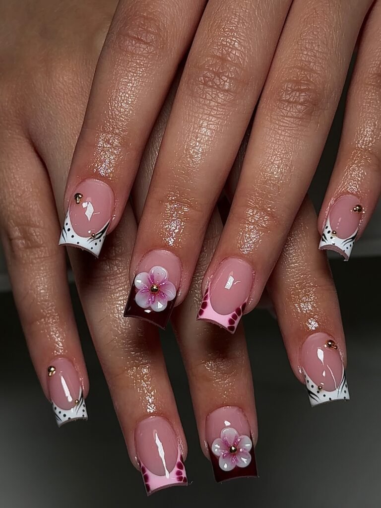 This floral manicure is romantic, artistic, and full of Pinterest appeal. The soft pink base is paired with burgundy French tips and delicate flower accents, creating a beautiful mix of sweetness and depth. The design feels feminine without being too soft, making it ideal for special occasions or stylish everyday wear. It’s a lovely choice for anyone who loves detailed, elegant nail art.