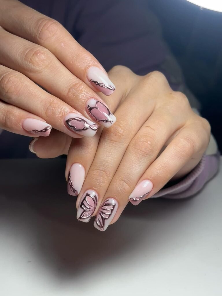 Soft Pink Butterfly Nails with Chrome Accents