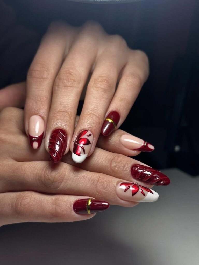 These deep red butterfly nails are bold, glamorous, and ideal for holiday season inspiration. The rich burgundy tones, glossy finish, and ribbon-like butterfly details make this manicure feel festive yet sophisticated. Perfect for winter parties, date nights, or Christmas nail ideas, this design adds drama without losing its elegant charm. Save this look if you love statement nails with luxurious red shades and artistic accents.