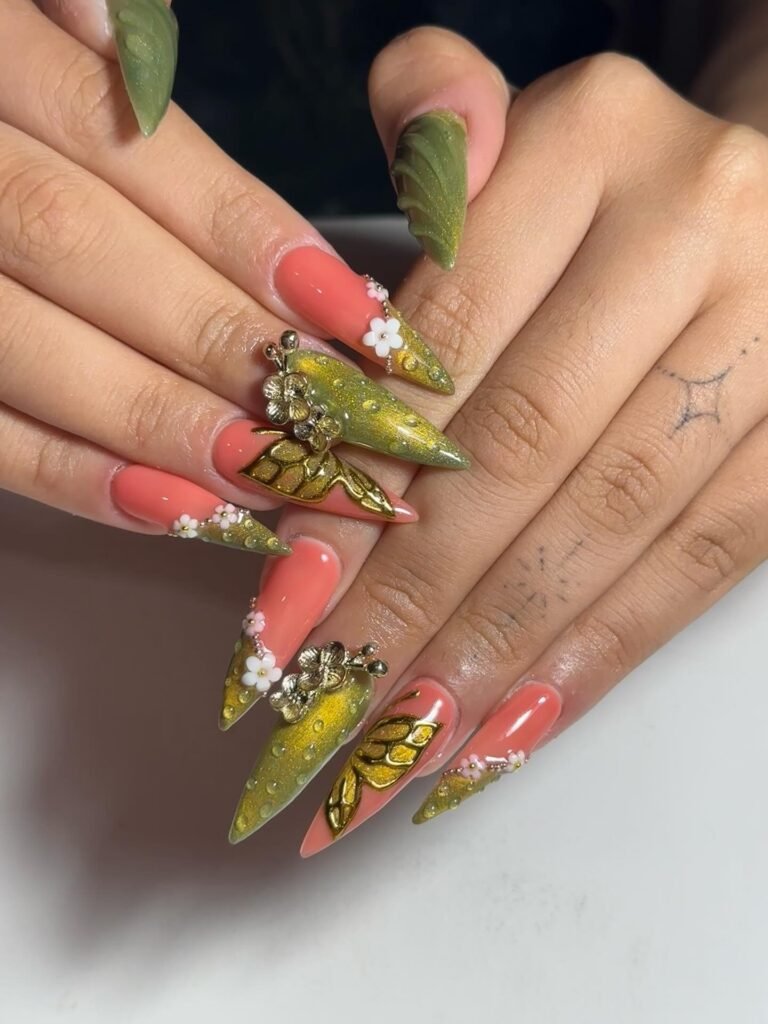 Coral and Olive 3D Butterfly Stiletto Nails
