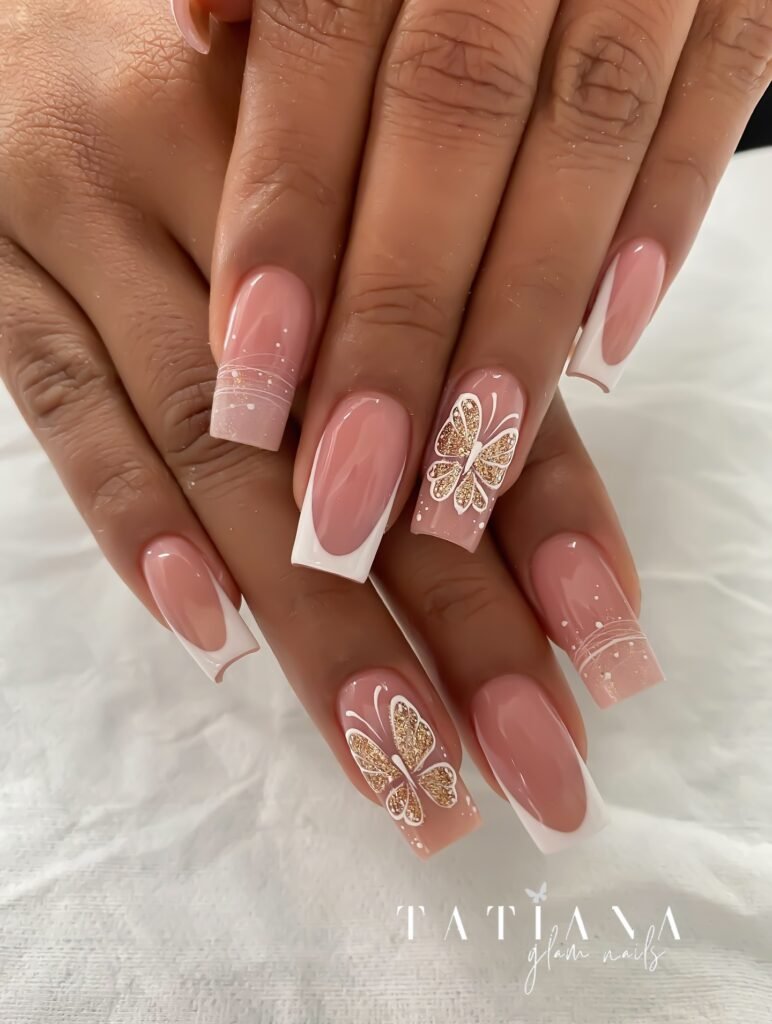 This nude pink butterfly French tip set is classic, polished, and incredibly pretty for any occasion. The square shape, crisp white tips, and glitter butterfly accents create a refined manicure that feels bridal, elegant, and timeless. It’s a stunning idea for weddings, birthdays, or anyone who prefers soft glam nails with a touch of sparkle. If classy butterfly nails are your thing, this look is absolutely worth saving.