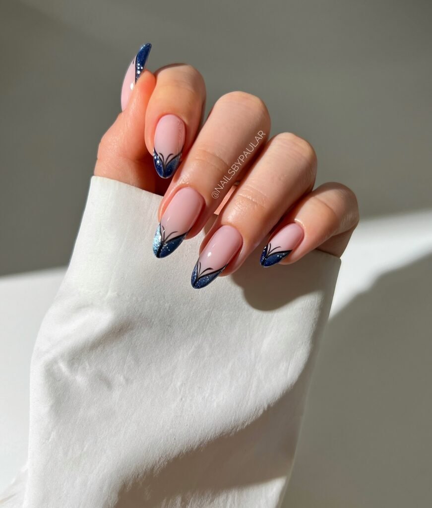 This blue butterfly nail design blends dreamy colors with delicate wing-inspired details for a modern, artistic manicure. The mix of soft nude, sky blue, and watercolor effects gives the nails a light and ethereal feel, while the butterfly wing accent adds the perfect focal point. If you’re searching for trendy butterfly nails that feel creative yet wearable, this set is a gorgeous choice to pin now.