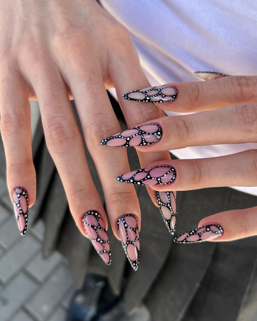 This black butterfly wing nail design is bold, graphic, and incredibly striking for statement manicure lovers. The stiletto shape, negative space details, and dotted outlines create a stained-glass butterfly effect that looks modern and edgy. It’s a perfect choice for fashion-forward Pinterest boards, dramatic nail art inspiration, or anyone wanting something unforgettable. Save this set if you love high-impact butterfly nails with a sleek, artistic finish.