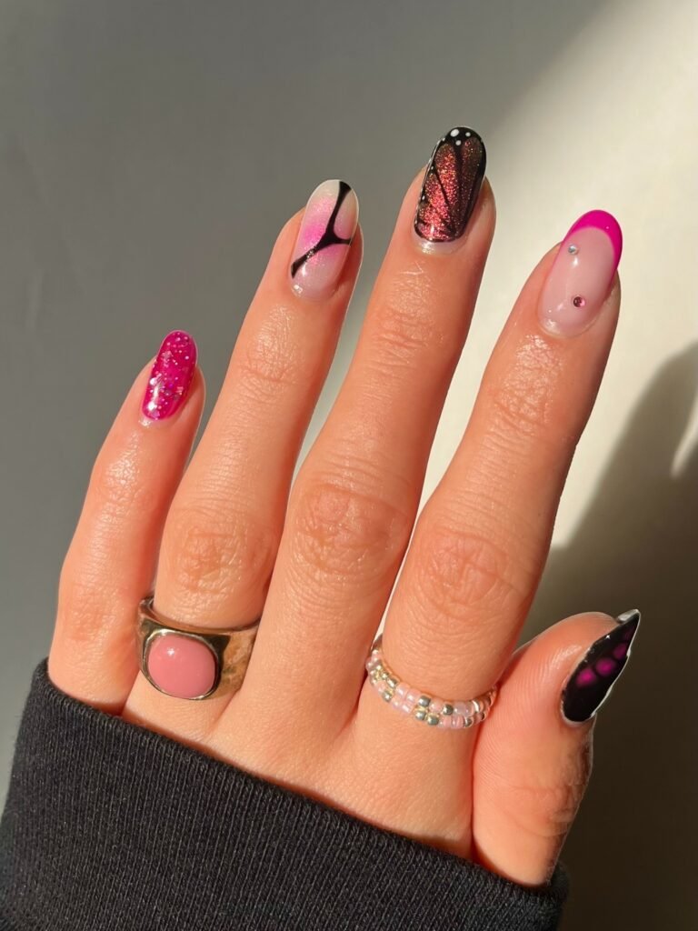 These pink and black butterfly nails are edgy, glamorous, and made for bold beauty lovers. The bright pink shimmer, dark butterfly wing art, and glossy finishes create a striking contrast that instantly grabs attention. This manicure is perfect for nights out, trend-focused looks, or anyone who loves dramatic nail inspiration on Pinterest. Save this design if you want butterfly nails with attitude, sparkle, and a fashionable statement vibe.
