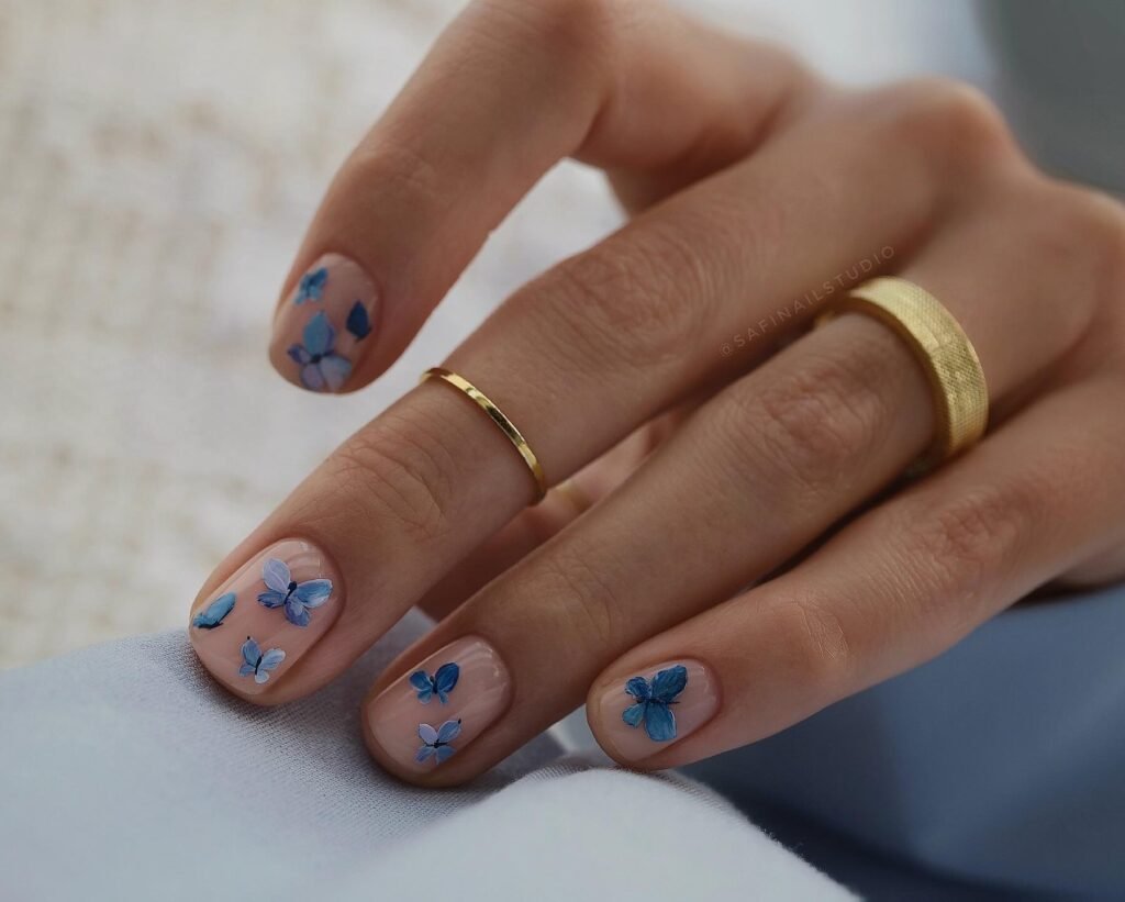 Minimal Nude Nails with Tiny Blue Butterflies