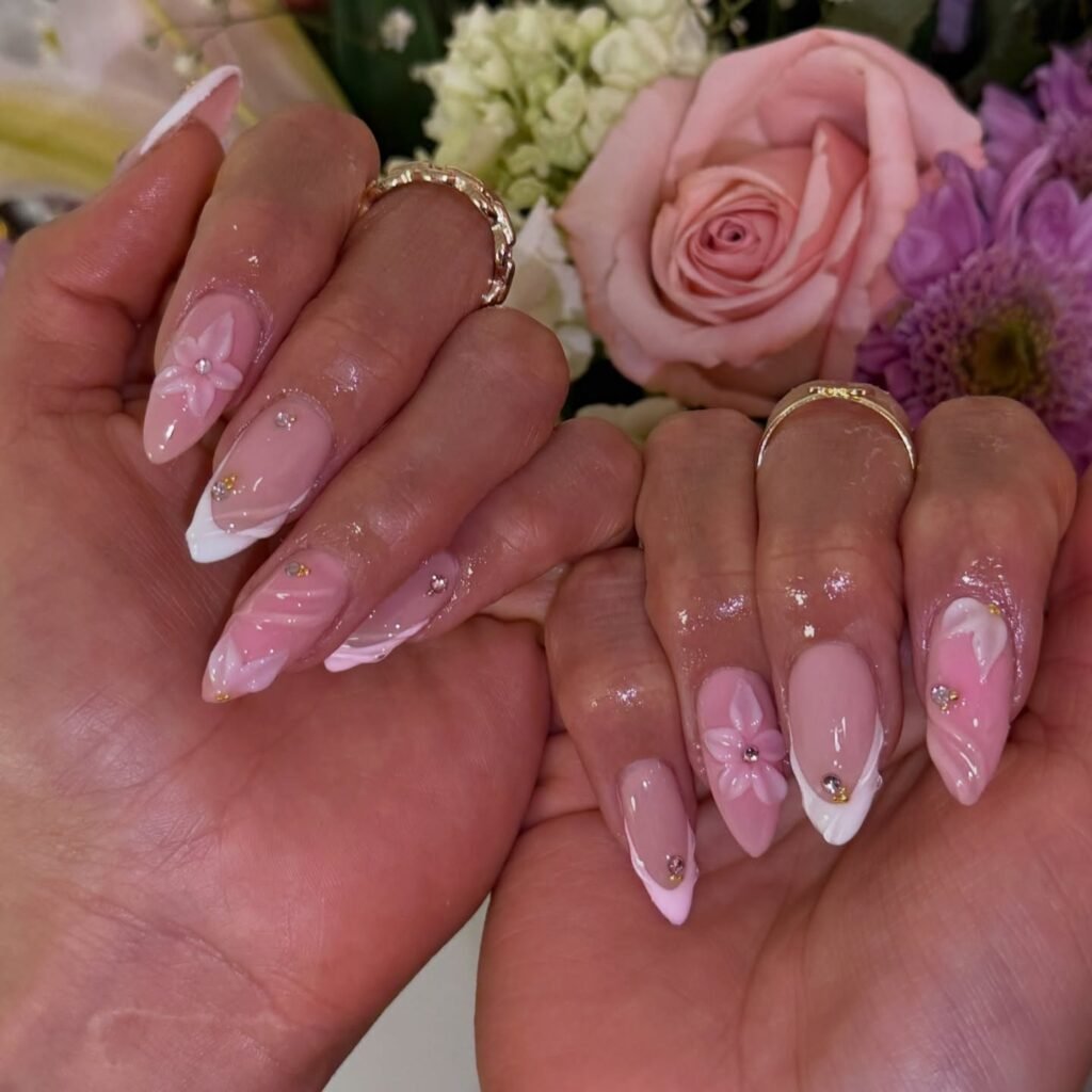 Soft pink 3D floral nails are always a yes, especially when they’re paired with glossy finishes, white swirls, and tiny gem accents. This set feels romantic, delicate, and slightly bridal, making it perfect for spring celebrations or a dressed-up everyday look. If you want cute pink nails that feel elegant and detailed without being too loud, this design is one you’ll want to save immediately.