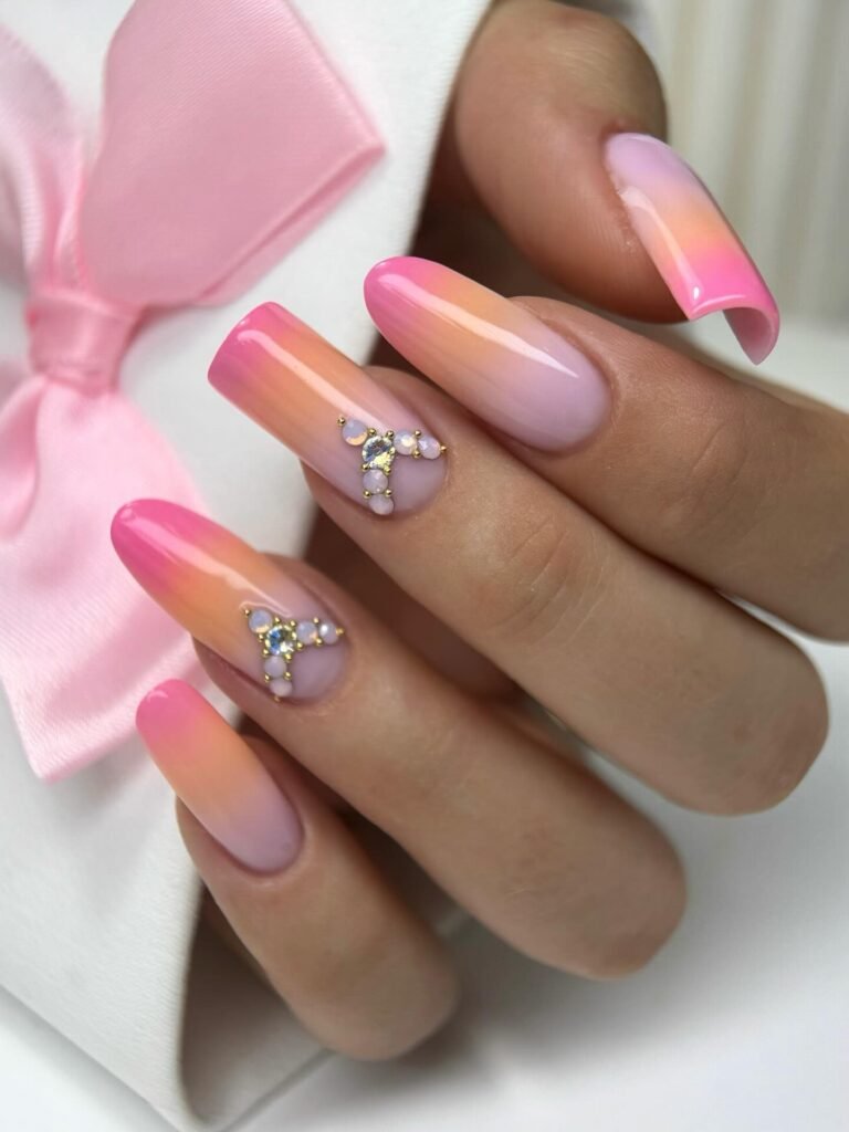 This ombré pink set feels like a sunset in manicure form. The blend of blush, peach, and vibrant pink creates a soft gradient that still stands out, and the crystal accents add a luxe touch without overwhelming the design. If you love glamorous pink nails that feel trendy, feminine, and a little extra, this is a beautiful look to pin for special occasions.