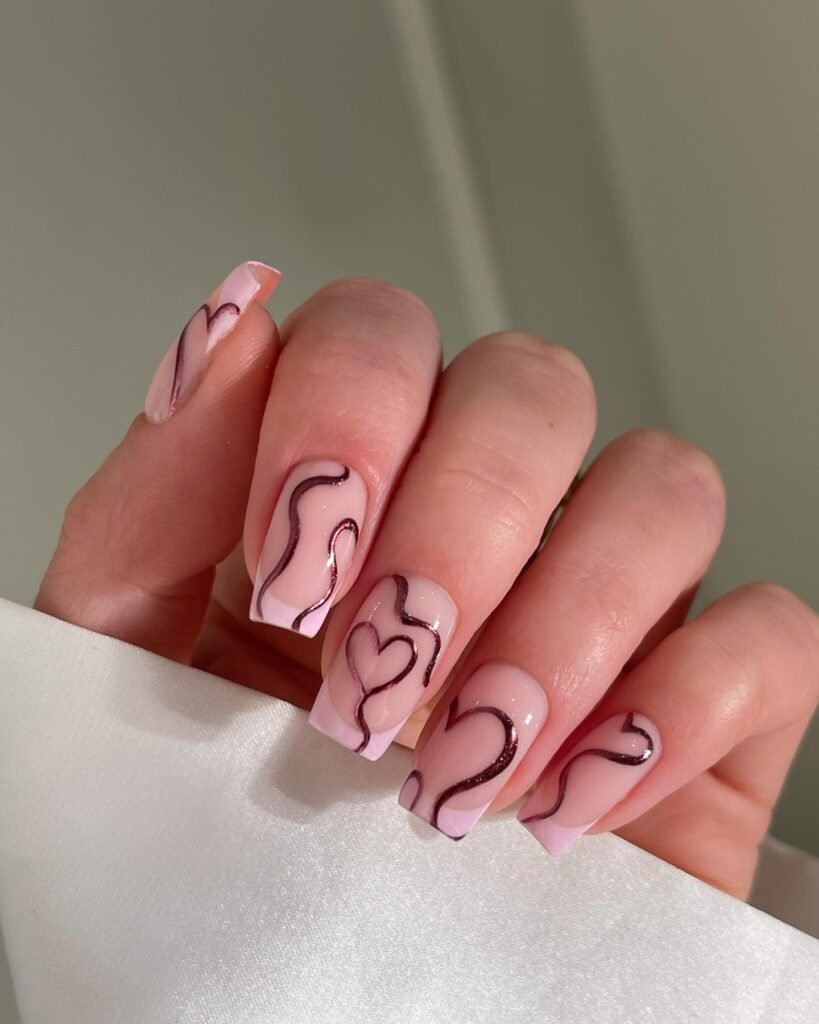 These blush pink square nails prove that cute can still feel modern. The abstract dark-lined hearts and swirls give this manicure an artsy, playful twist without taking away from the soft romantic base. If you want Valentine-inspired nails that don’t look too obvious, this design is perfect for saving now and wearing long after the holiday season ends. It feels fresh and trendy.
