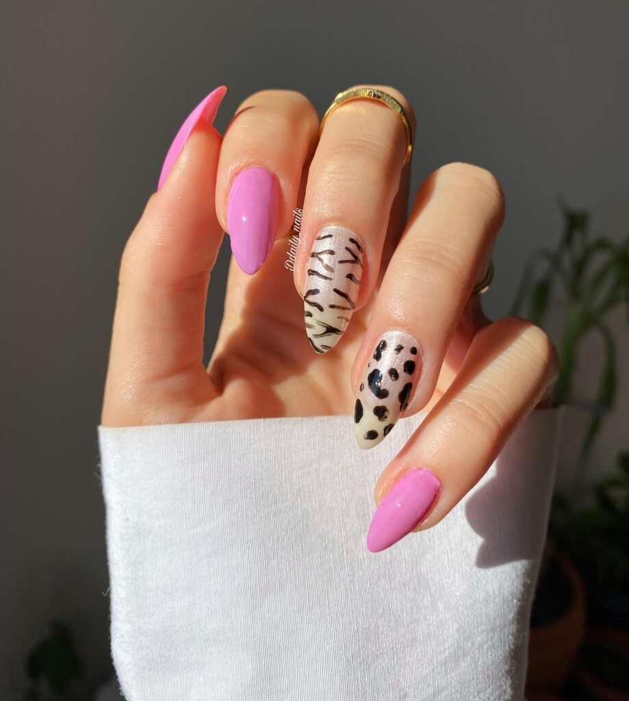 This mixed pink and animal-print manicure is for anyone who loves a playful, fashion-forward vibe. The solid lavender-pink nails balance the bold zebra and leopard accents, creating a set that feels edgy but still cute. It’s the perfect reminder that pink nails don’t always have to be soft and sweet—they can be daring, trendy, and totally unique too. Especially for summer.