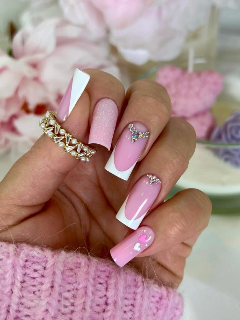 For a coquette-inspired manicure, this pink and white set is pure inspiration. The glossy finish, crisp French tips, rhinestone details, and mini heart accent make the design feel flirty, polished, and ultra cute. It’s a great option if you want pink acrylic nails that look dressed up but still wearable, especially for birthdays, date nights, or a fun girls’ weekend.