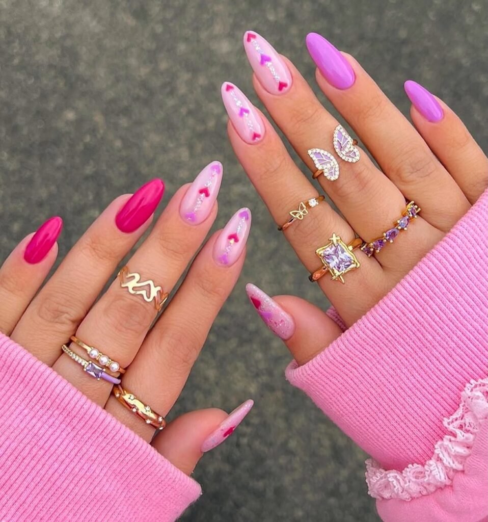 If your Pinterest boards are full of girly, maximalist beauty looks, this set belongs at the top. The mix of hot pink, lilac, glitter, and tiny heart accents feels fun, youthful, and full of personality. Paired with stacked rings and a cozy pink sleeve, these nails create the ultimate statement manicure for anyone who loves bold color with soft feminine details.