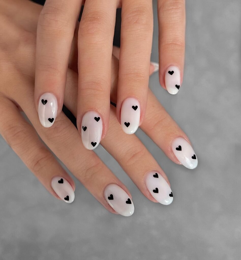 Minimal but still undeniably cute, these milky white nails with tiny black hearts are the ultimate soft-girl monochrome moment. The design feels delicate, romantic, and easy to wear, whether you’re dressing up for Valentine’s Day or just love subtle charm year-round. Pinterest users are always searching for simple nail ideas with personality, and this manicure hits the sweet spot between clean, classic, and playful.