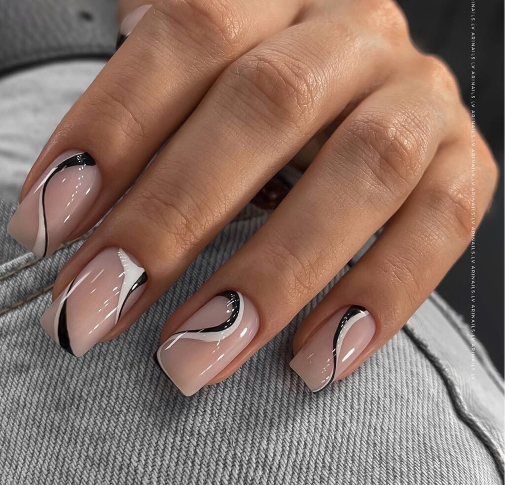 For anyone who loves minimalist nail art with a high-end feel, this nude base and flowing black-and-white line work is a dream. The curved detailing creates movement without overwhelming the manicure, so it stays chic, clean, and very save-worthy. This is the perfect inspo for office-friendly nails, understated events, or anyone craving a modern design that balances softness, structure, and timeless monochrome style.