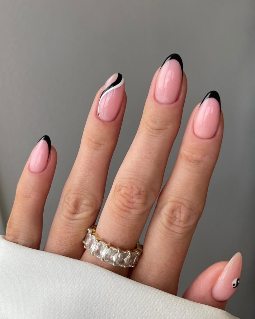 If you’re into quiet luxury nails, this soft pink manicure with sleek black French tips is the definition of subtle sophistication. The single accent swirl adds just enough personality while keeping the overall look refined and elegant. Perfect for Pinterest boards filled with bridal beauty, capsule wardrobes, and clean-girl styling, this design works beautifully for everyday wear, date nights, and polished special-occasion moments.