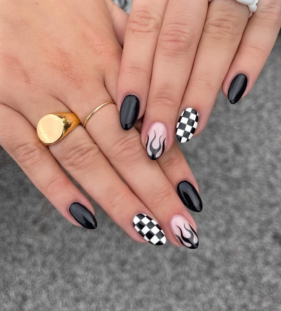 Bold black polish, checkerboard accents, and smoky flame art make this manicure feel edgy, graphic, and full of attitude. It’s a perfect match for Pinterest users drawn to alternative fashion, streetwear styling, or statement beauty looks that stand out instantly. Despite the dramatic contrast, the almond shape keeps everything sleek and flattering. This set is ideal for anyone wanting cool, confident nails with serious visual impact.