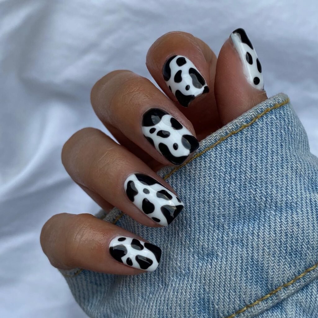 Cow print continues to trend for a reason, and this glossy black-and-white version feels especially cool against a denim backdrop. The pattern is fun, fashion-forward, and surprisingly wearable, making it a favorite for Pinterest boards packed with Y2K, western, and street-style beauty ideas. If you want a manicure that feels playful yet modern, this bold print is an easy conversation starter with a standout personality.