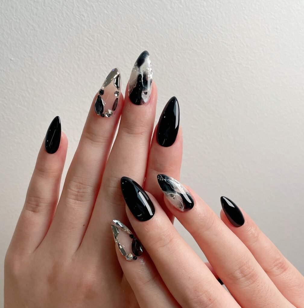 Moody, glossy, and unapologetically glam, this black almond manicure proves that monochrome never has to feel simple. The crystal accents and smoky marble details add a luxe, editor-approved finish that instantly elevates the solid black nails. If you love dramatic Pinterest-worthy sets for nights out, birthdays, or winter styling, this design delivers bold elegance with just the right amount of sparkle and edge.