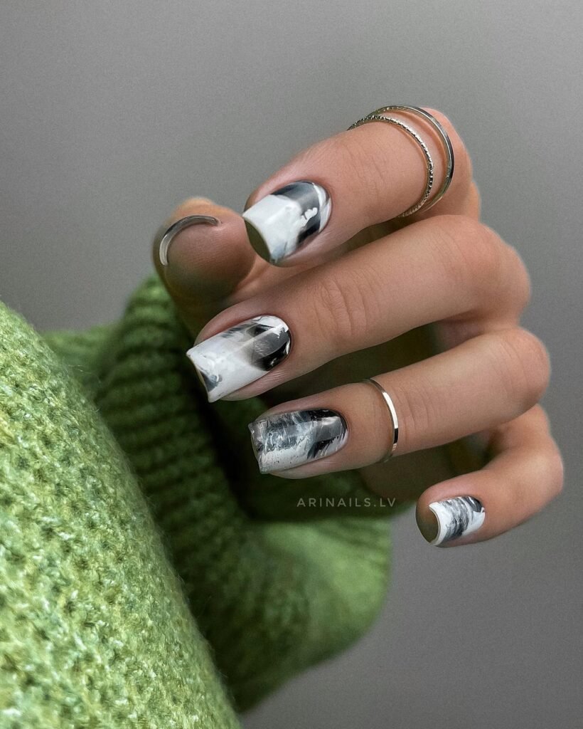 This silver, white, and charcoal marble manicure looks like wearable art. The glossy square shape gives the design a polished finish, while the smoky blending adds depth and a soft metallic vibe. It’s an ideal choice for Pinterest users who love elevated neutrals, cozy sweater-weather beauty, and nails that feel expensive without using bright color. Chic, moody, and modern, this set photographs beautifully from every angle.
