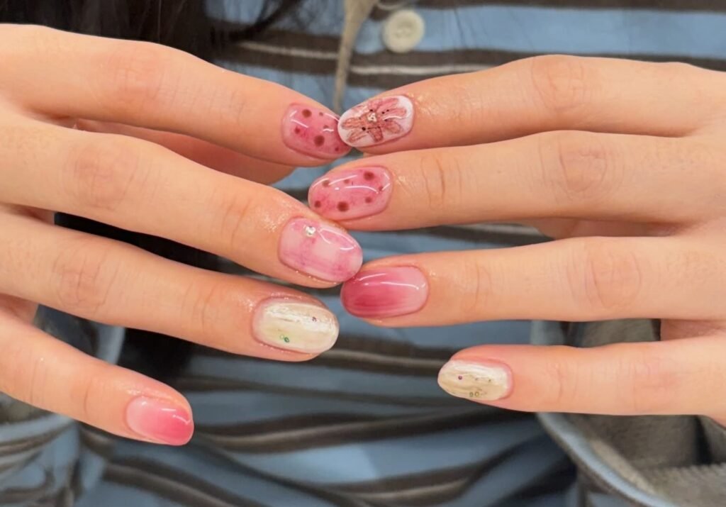 Soft pink jelly nails meet playful polka dots and delicate floral art in this dreamy manicure that feels straight out of a Pinterest beauty board. The glossy finish adds a fresh, youthful glow, while each nail keeps its own unique detail. Perfect for spring dates, brunch outfits, or anyone saving cute Korean nail ideas, this look blends sweet charm with modern elegance beautifully.