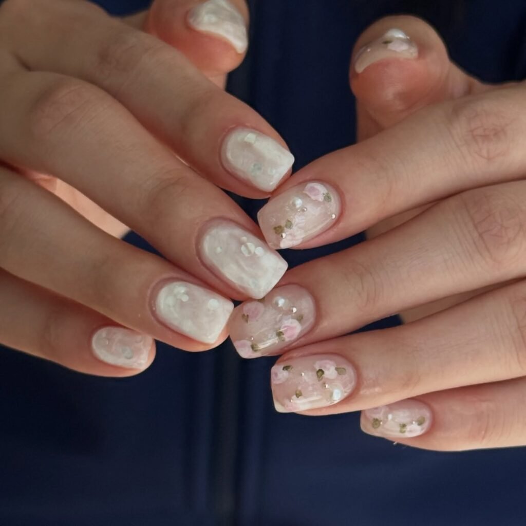 This creamy pearl-white manicure is the definition of soft luxury. Featuring floral accents, translucent pink bases, and tiny pearl embellishments, it creates an airy, romantic style that Pinterest users love to save for weddings, showers, and minimalist glam inspiration. The mix of texture and shine makes these nails feel elegant without being overdone, giving you a timeless design that looks polished in every season.