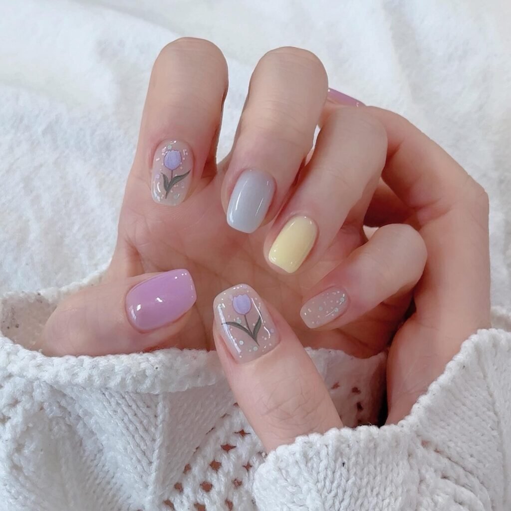 Pastel lovers will instantly fall for this sweet tulip manicure featuring lilac, butter yellow, soft gray, and sheer dotted accents. The floral illustrations give it a gentle handmade feel, while the glossy finish keeps everything polished and modern. This is the kind of nail design Pinterest users pin for spring outfits, cozy aesthetics, and feminine beauty inspiration that feels delicate, fresh, and wonderfully easy to wear.