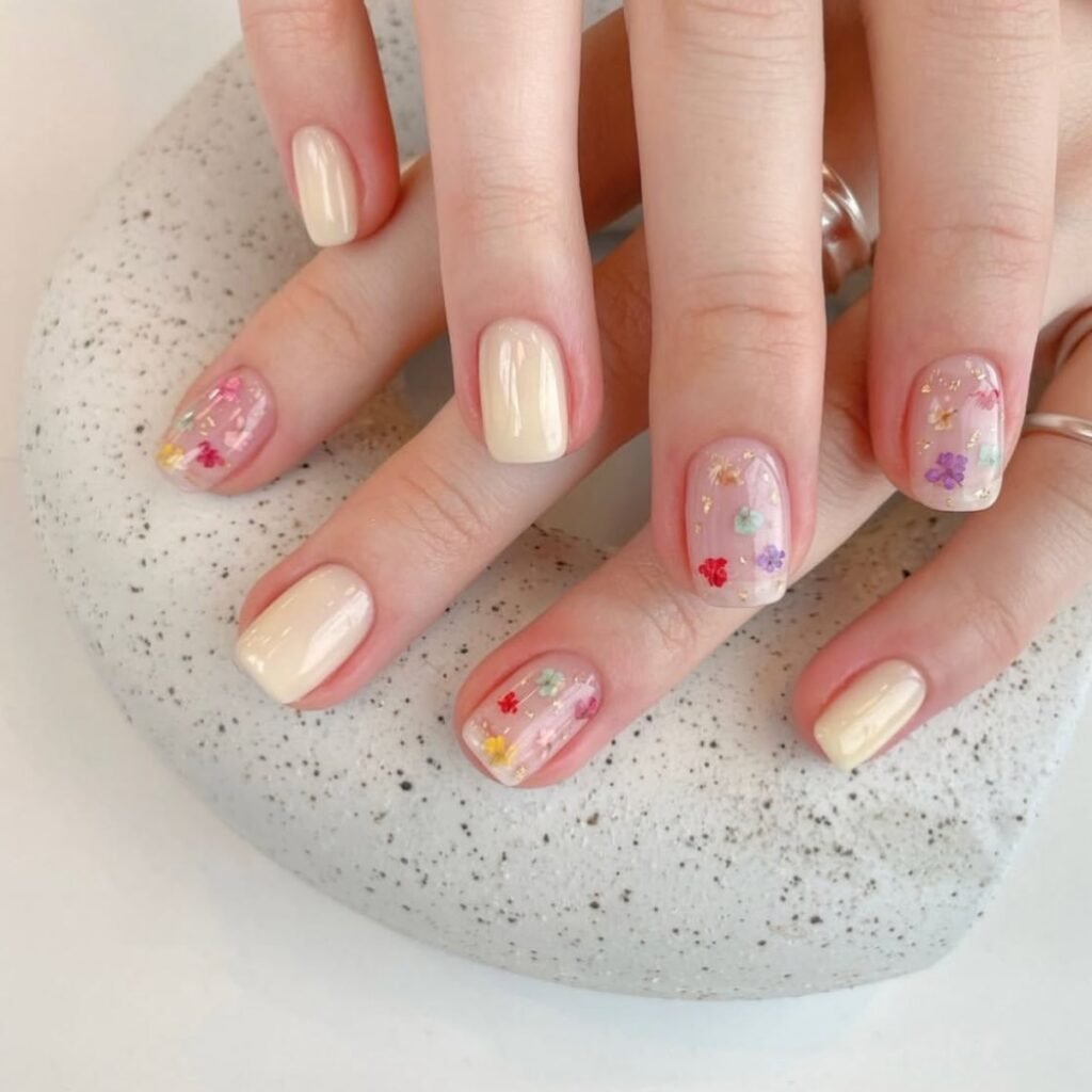 This creamy nude manicure with colorful tiny flowers is a Pinterest favorite waiting to happen. The solid ivory nails balance the transparent floral accents, creating a fresh, clean look that feels playful and refined at the same time. It’s perfect for spring, bridal showers, vacation beauty boards, or everyday wear when you want soft nail art that still catches attention in a subtle, charming way.