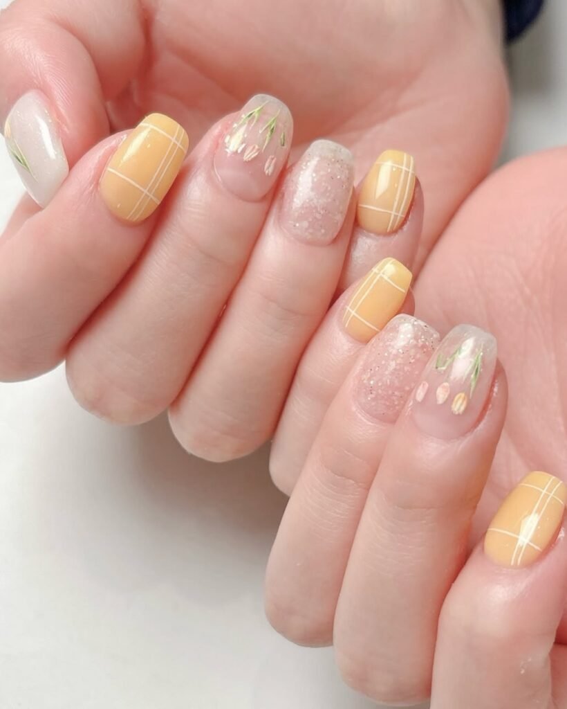 Sunny yellow plaid nails paired with delicate tulip art bring cheerful cottagecore energy to your next manicure mood board. This design feels bright, clean, and softly playful, making it perfect for spring fashion, weekend outings, or fresh seasonal content. Glitter accents add extra sparkle without overwhelming the look, while the transparent floral nails keep everything light, trendy, and effortlessly Pinterest-worthy.