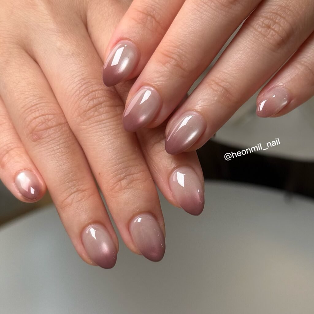 For a chic minimalist manicure with a modern glow, this mauve ombré design is a standout save. The smooth gradient fades from sheer nude into a smoky rose tip, creating a polished cat-eye effect that looks effortlessly sophisticated. Pinterest users who love clean beauty, neutral palettes, and elevated everyday nails will appreciate how versatile this manicure is for work, weekends, special events, and every season.