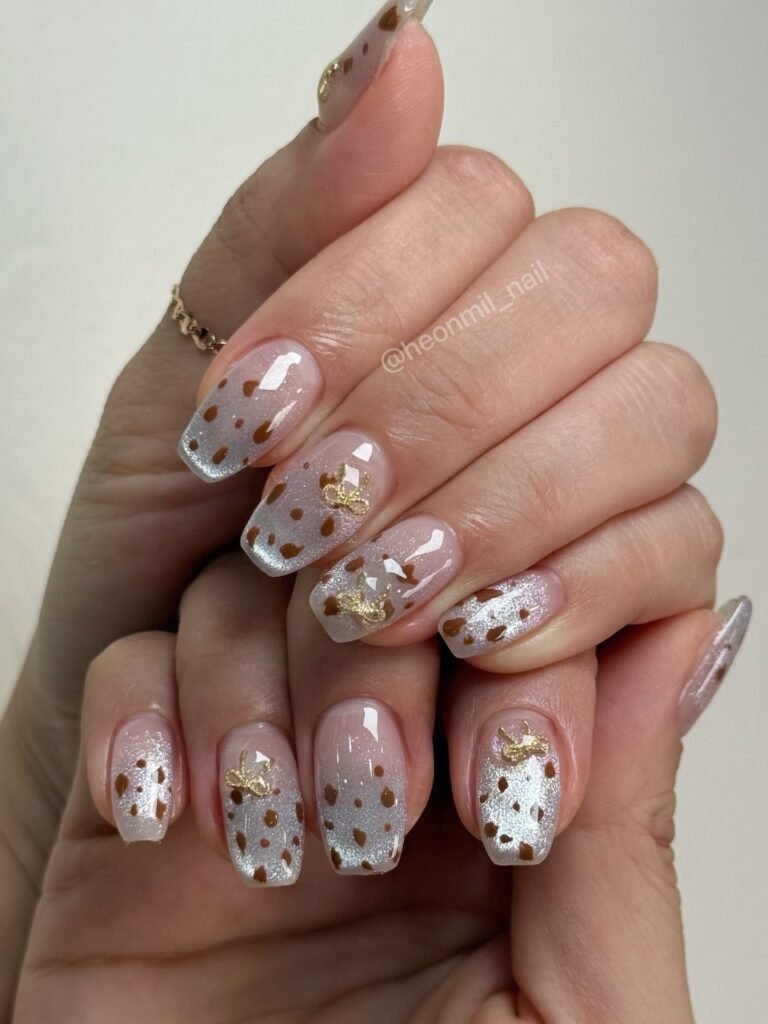 If you love neutral nails with a little personality, this silver shimmer and mocha dot design is a must-save. The subtle sparkle creates a frosted effect, while gold bow details add just the right touch of charm. It’s a stylish option for anyone who wants classy nail art with a playful twist, making this manicure perfect for everyday wear, winter looks, and chic Pinterest collections.