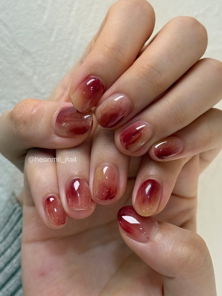 These deep berry watercolor nails are moody, glossy, and perfect for anyone drawn to rich, artistic manicures. The blended red and brown tones create a syrupy glass effect that feels luxurious yet understated. Ideal for fall boards, evening style inspiration, or trendy Korean nail saves, this design proves that short nails can still make a bold statement while staying elegant, wearable, and beautifully polished.
