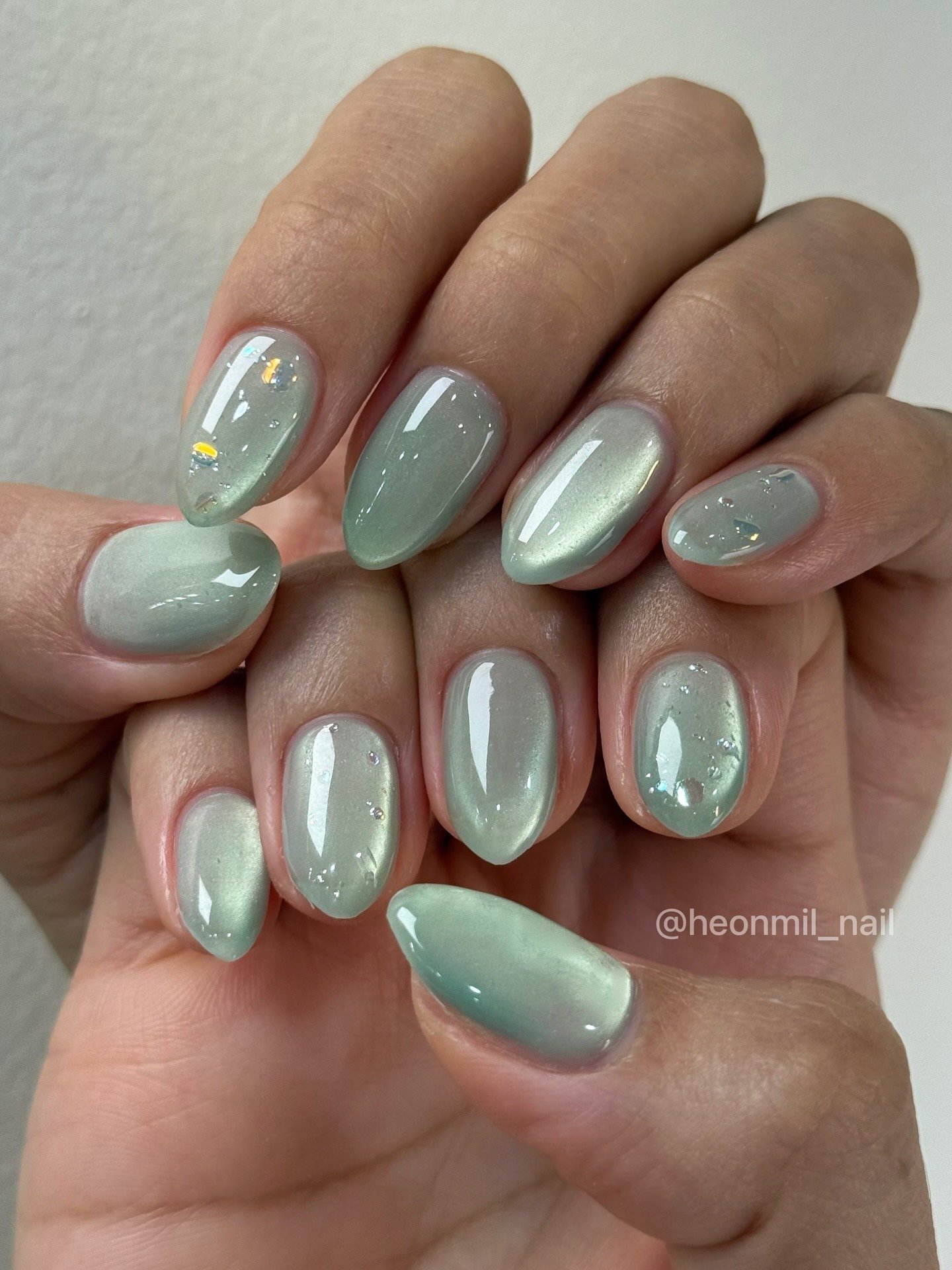 These soft mint cat-eye nails capture that cool, glossy glow Pinterest beauty lovers are constantly searching for. The delicate shimmer shifts beautifully in the light, creating a clean, modern manicure that feels calming and elevated. Tiny crystal details add a subtle luxe finish without taking away from the minimalist vibe. Save this look for spa-inspired beauty ideas, elegant everyday nails, or fresh seasonal inspiration.