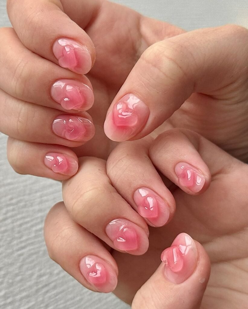 Jelly nails feature sheer, tinted polish that gives your nails a glossy, glass-like effect. Unlike opaque manicures, this trend lets light shine through, creating a soft, squishy look that’s perfect for sunny days.