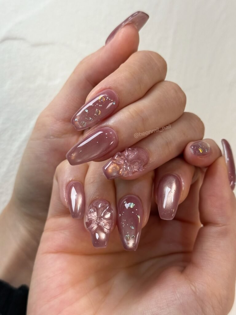 Soft mauve jelly nails meet glossy shine and subtle crystal accents in this dreamy design. The translucent finish creates a plump, glassy effect, while embedded gems and 3D floral details add dimension without overpowering the look. Perfect for everyday glam or romantic date nights, this manicure feels modern, feminine, and effortlessly chic. Save this look if you adore soft pink tones with a touch of sparkle.