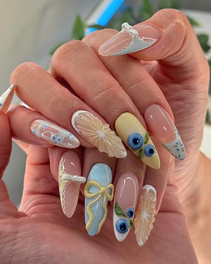 5. Pastel Blue & Lemon 3D Art Nails