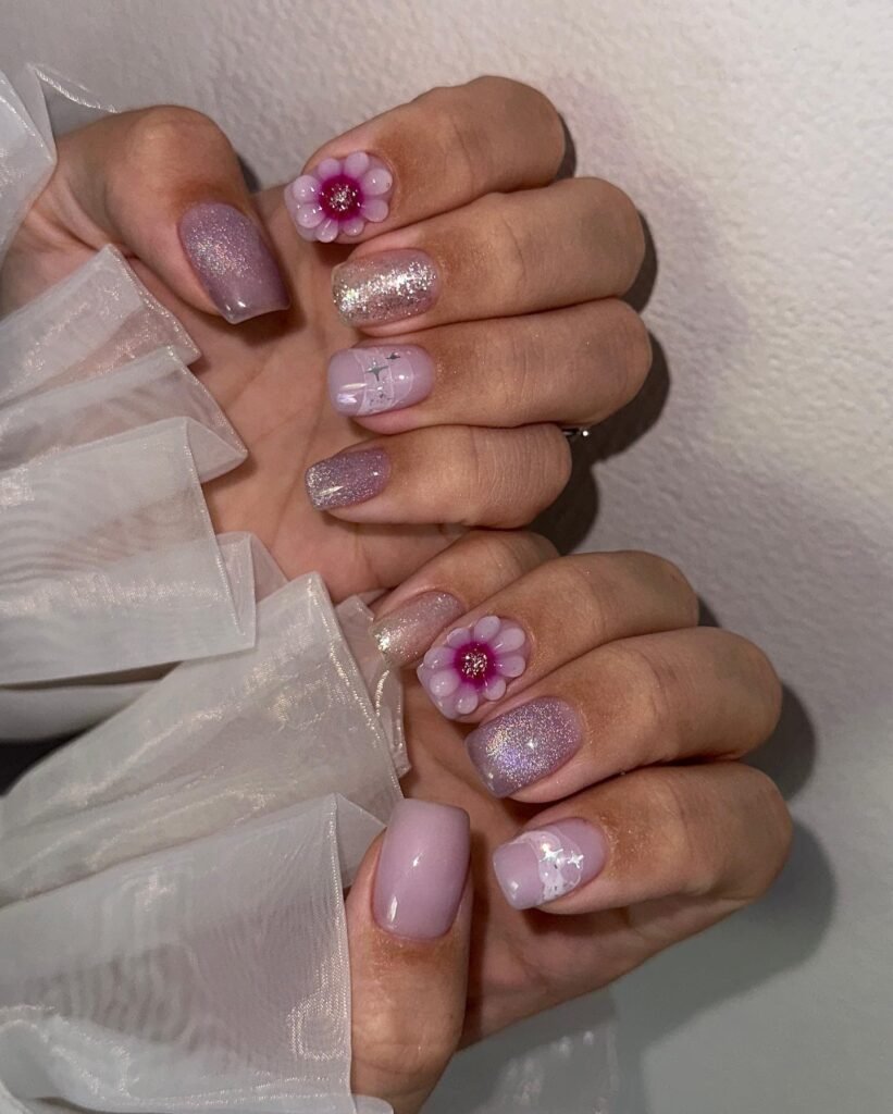 10. Lavender Glitter Floral Nails