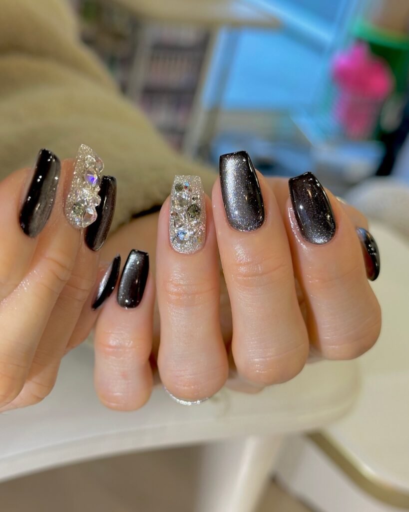These black chrome nails combine mirror-like shine with bold crystal accents for a luxe, high-impact look. The metallic finish reflects light beautifully, while fully embellished accent nails add extra sparkle. Perfect for evening glam or statement style lovers, this manicure feels edgy yet sophisticated. If dramatic, fashion-forward nails are your vibe, this design belongs on your inspiration board.