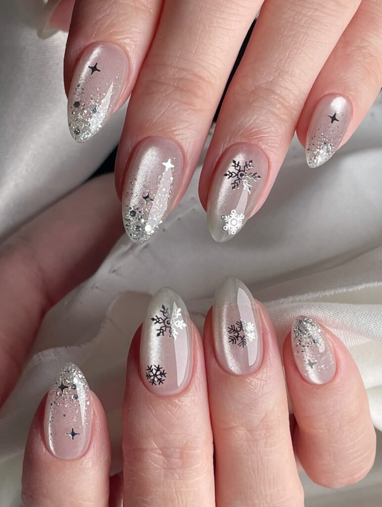 These pearly silver nails sparkle with delicate snowflake and star details, creating the ultimate winter wonderland manicure. A soft chrome sheen pairs beautifully with glitter gradients for a frosty, magical finish. The subtle nude undertone keeps the look elegant and wearable. Perfect for holiday parties or cozy winter days, this design captures the charm of freshly fallen snow.