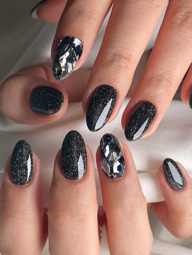 6. Black Glitter Statement Gem Nails