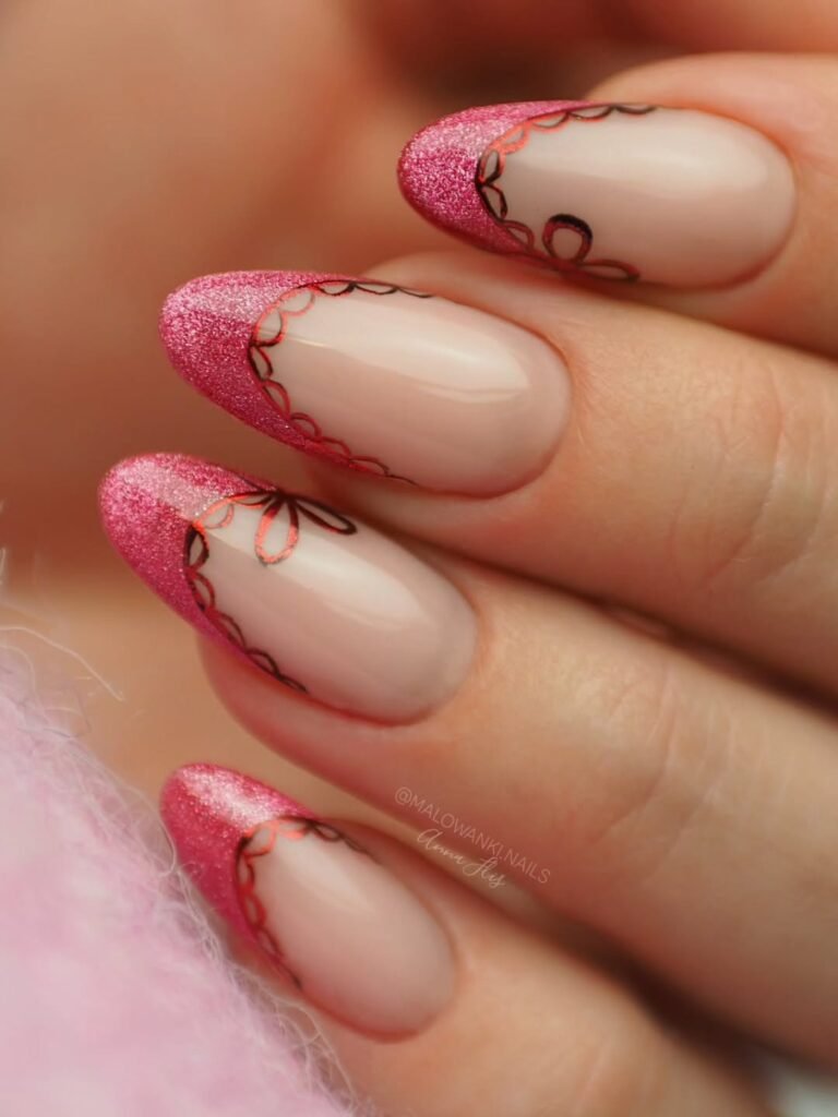 If you love glitter with a chic twist, this pink lace French manicure is a dreamy choice. The sparkling pink tips bring playful energy, while the thin black scalloped detail mimics delicate lace for a refined finish. It’s a gorgeous design for date nights, birthdays, Valentine’s looks, or anyone wanting a bold yet elegant nail idea to pin and recreate.