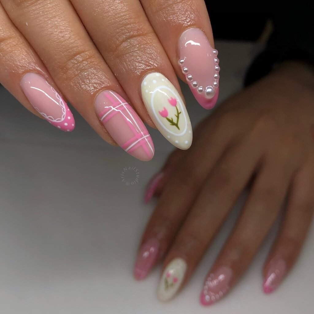 This sweet pink manicure mixes lace-inspired details, tiny pearls, plaid lines, and floral art for the ultimate coquette nail look. Every nail feels unique, yet the soft pink palette keeps the set cohesive and wearable. Perfect for Pinterest users who love cute, girly nails, this design is ideal for spring, brunch dates, baby showers, or a playful everyday manicure with extra charm.