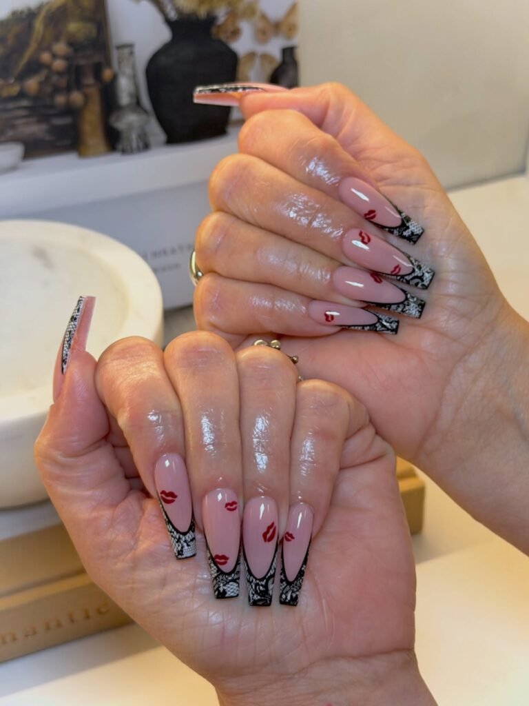 These black lace tip nails with tiny red lip accents are bold, trendy, and seriously scroll-stopping. The nude base keeps the design sleek, while the lace detailing adds drama without overwhelming the look. The red kisses give it a playful, fashion-forward vibe that Pinterest users will love saving for Valentine’s Day, girls’ nights, birthdays, or any moment that calls for confident, statement nails.