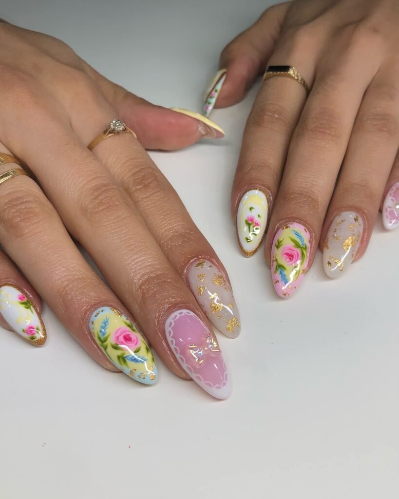 These pastel lace and floral nails are made for anyone obsessed with vintage garden party vibes. Soft pink, buttery yellow, hand-painted roses, and touches of gold foil create a manicure that feels delicate and luxurious. The scalloped lace edging adds a dainty finish that Pinterest readers will love for spring weddings, tea parties, Easter looks, or feminine nail inspiration with a romantic, artistic feel.