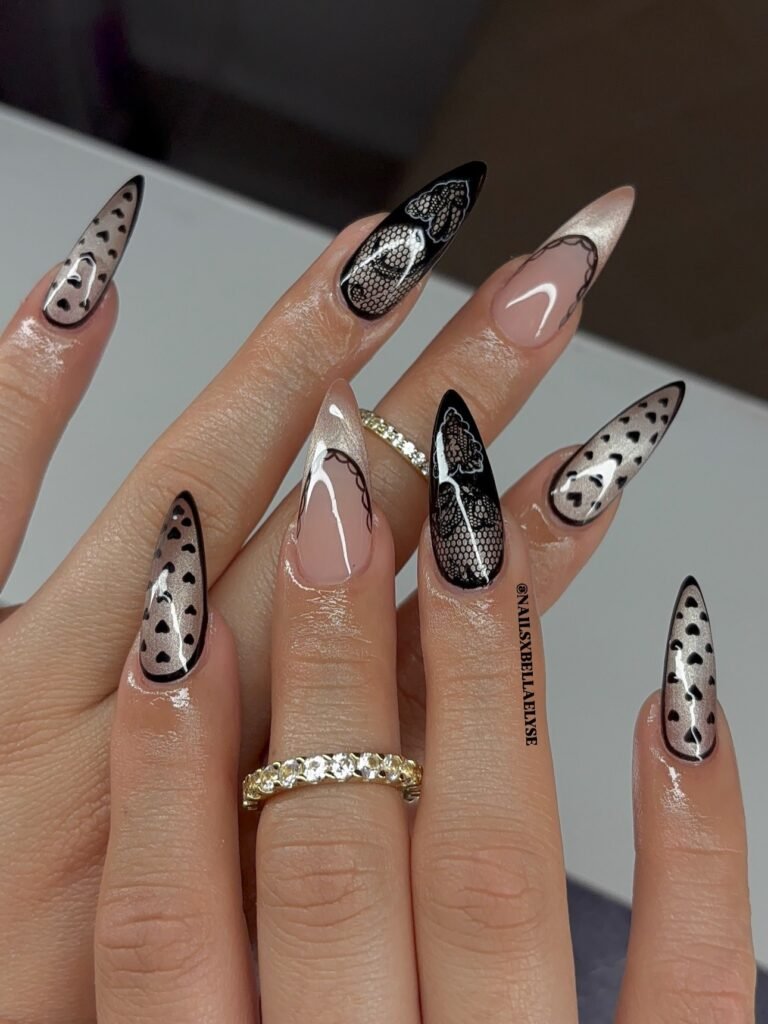 If your Pinterest board leans moody, glam, and a little edgy, these black lace nails are a must-save. The mix of sheer shimmer, tiny black hearts, and bold lace patterns creates a dramatic look that still feels polished. This manicure is perfect for fall, parties, evening events, or anyone who loves alternative nail art with a romantic, fashion-editorial twist vibe.