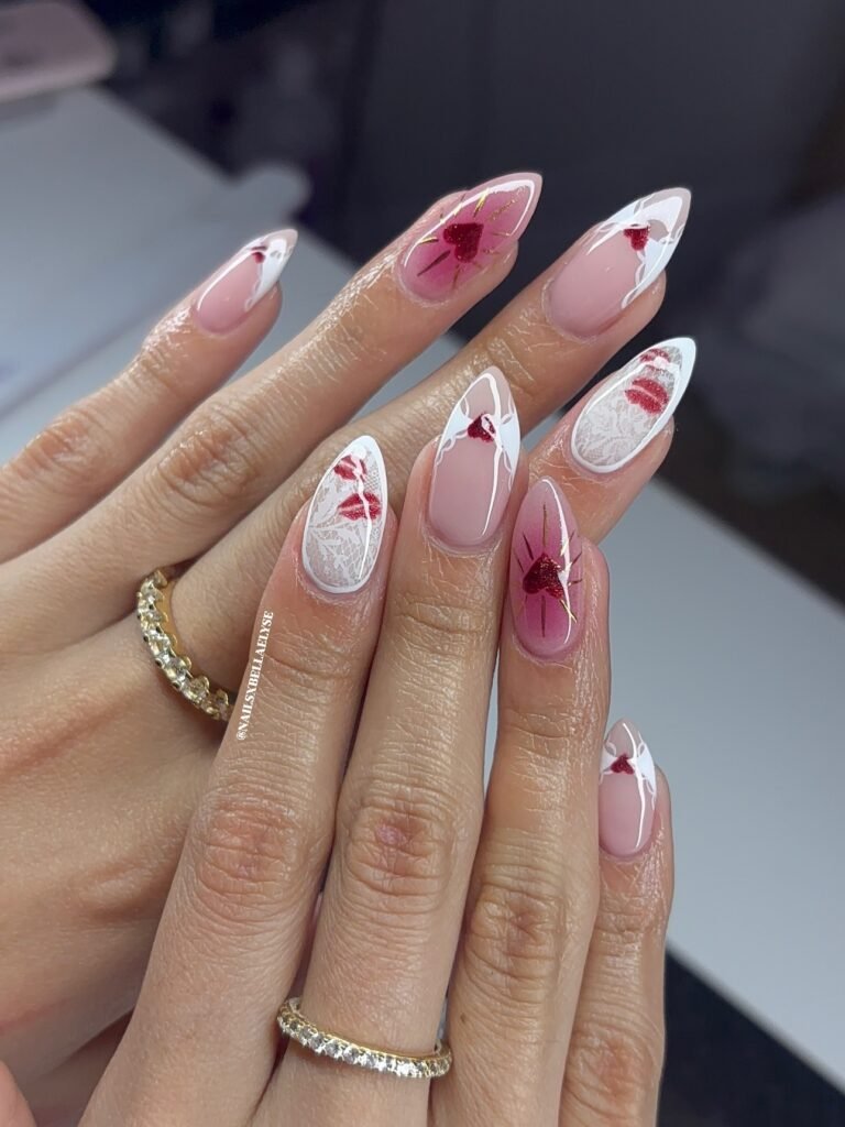 This romantic lace nail art set blends white detailing, soft pink tones, sparkly hearts, and kiss accents for a dreamy statement manicure. Each nail has its own moment, making the overall look feel creative, stylish, and perfect for close-up photos. Save this Pinterest-worthy design for Valentine’s Day, engagement season, date nights, or whenever you want nails that look feminine, playful, and a little glamorous.