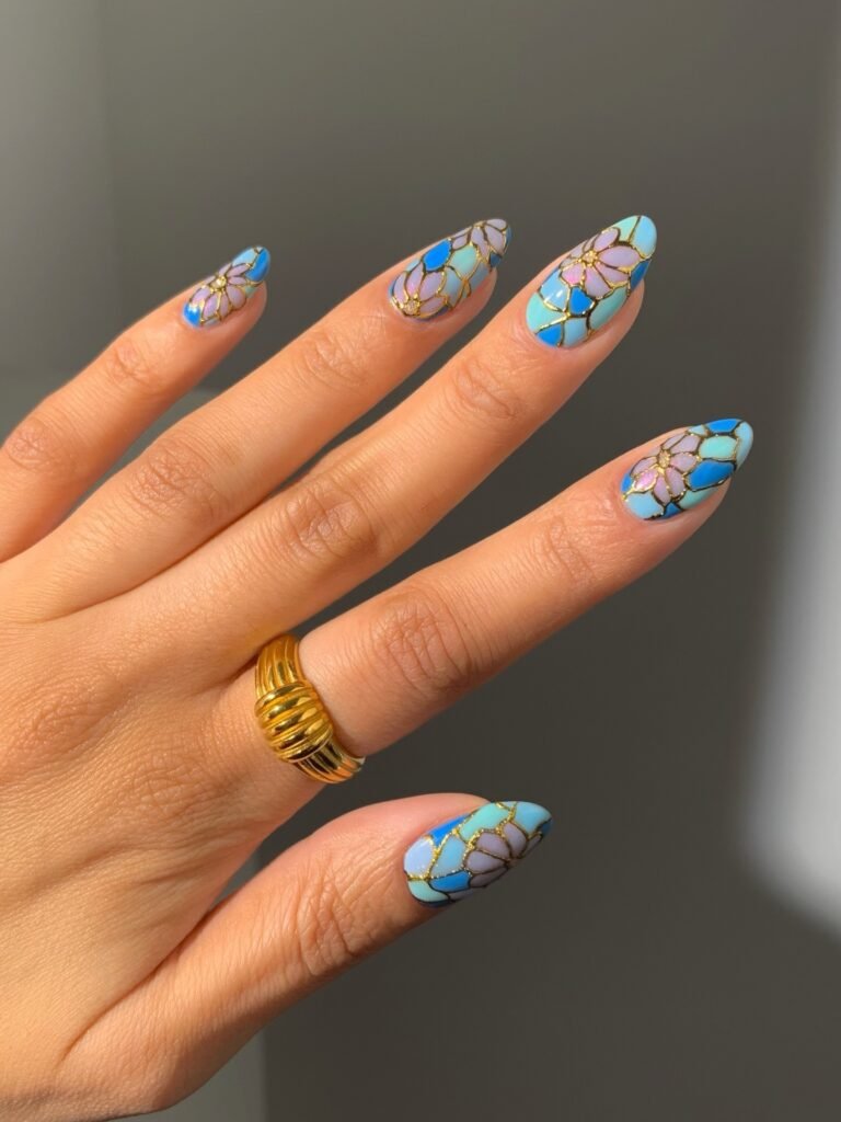 This blue stained-glass floral manicure is a true Pinterest showstopper. Soft sky blue, lavender, and periwinkle sections are outlined in fine gold, creating a mosaic effect that feels artistic, polished, and luxurious. The floral placement keeps the design feminine without losing its graphic edge. If you want nail inspo that looks unique, classy, and unforgettable in photos, this set absolutely deserves a save.