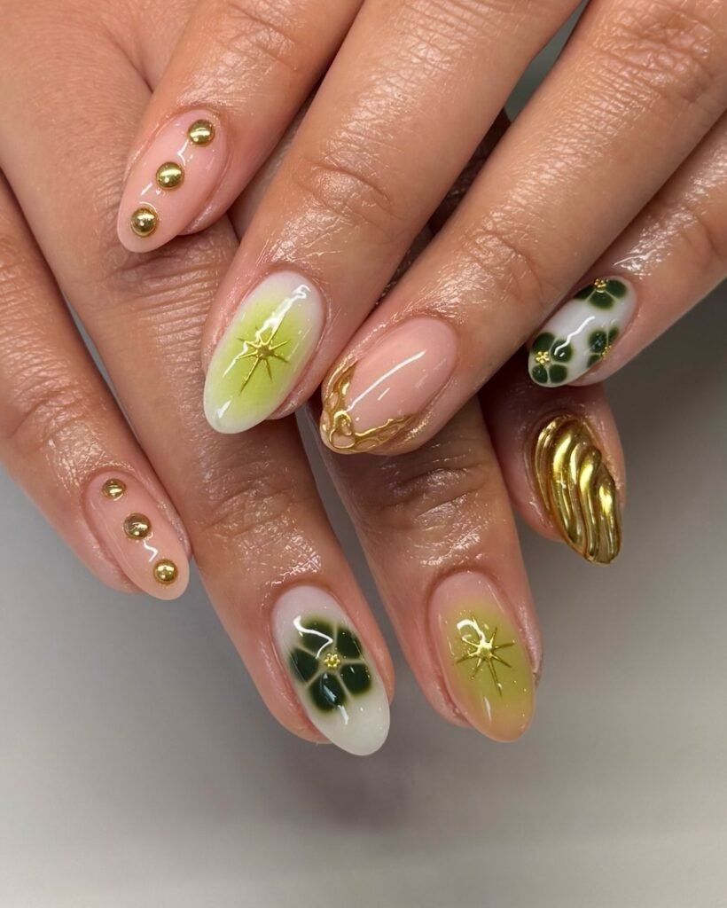 If your Pinterest board mixes earthy elegance with statement details, this set is a standout. Glossy nude, creamy white, mossy green, and lime ombré tones are elevated by gold studs, chrome texture, and tiny starbursts. Every nail feels different, yet the palette stays cohesive and luxe. It is a gorgeous choice for trend lovers who want artistic nails with a sophisticated, editor-inspired finish.