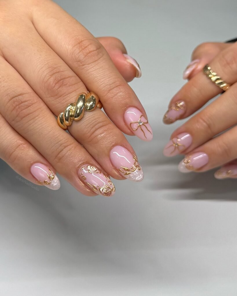 This blush pink manicure proves that elegant nail art does not need loud color to make an impact. Gold detailing, pearl-like texture, and tiny bow accents create a refined, coquette-inspired look that feels expensive and timeless. The soft almond shape adds even more grace. Pin this for weddings, engagement photos, holiday parties, or anytime you want your nails to feel romantic, polished, and ultra-feminine.