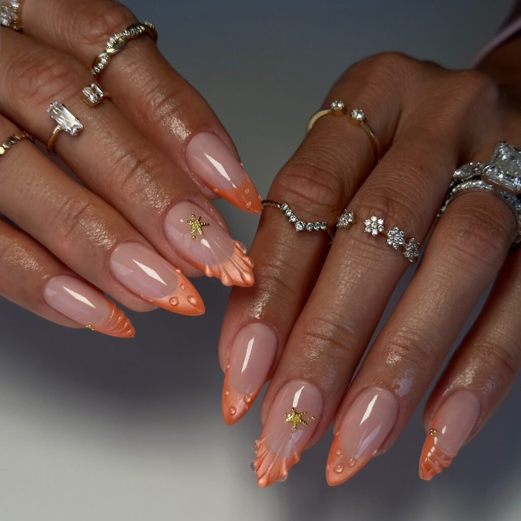 These peach seashell nails are perfect for anyone craving mermaid-core with a modern, wearable finish. The translucent nude base keeps the look soft, while sculpted shell details, tiny water-drop accents, and gold starfish charms bring coastal magic to life. They feel beachy without being overly themed. Pin this set for summer vacations, bridal trips, seaside birthdays, or whenever you want your manicure to look dreamy and vacation-ready.